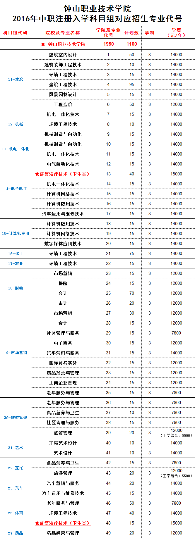 2016年中职注册入学招生计划