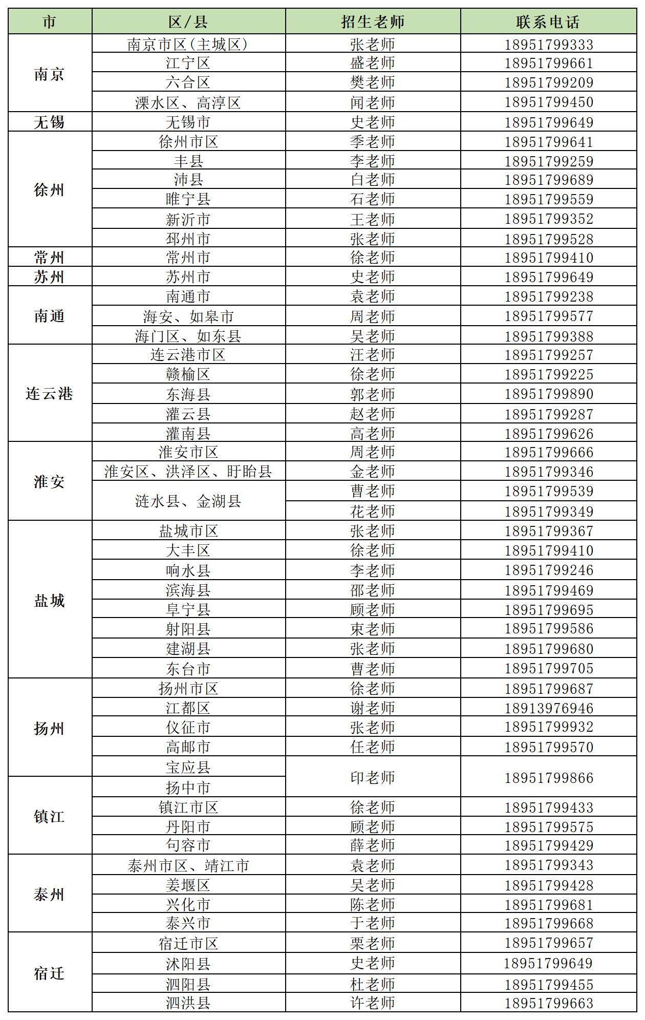 【高职提前招生】江苏省各地区招生老师及联系方式